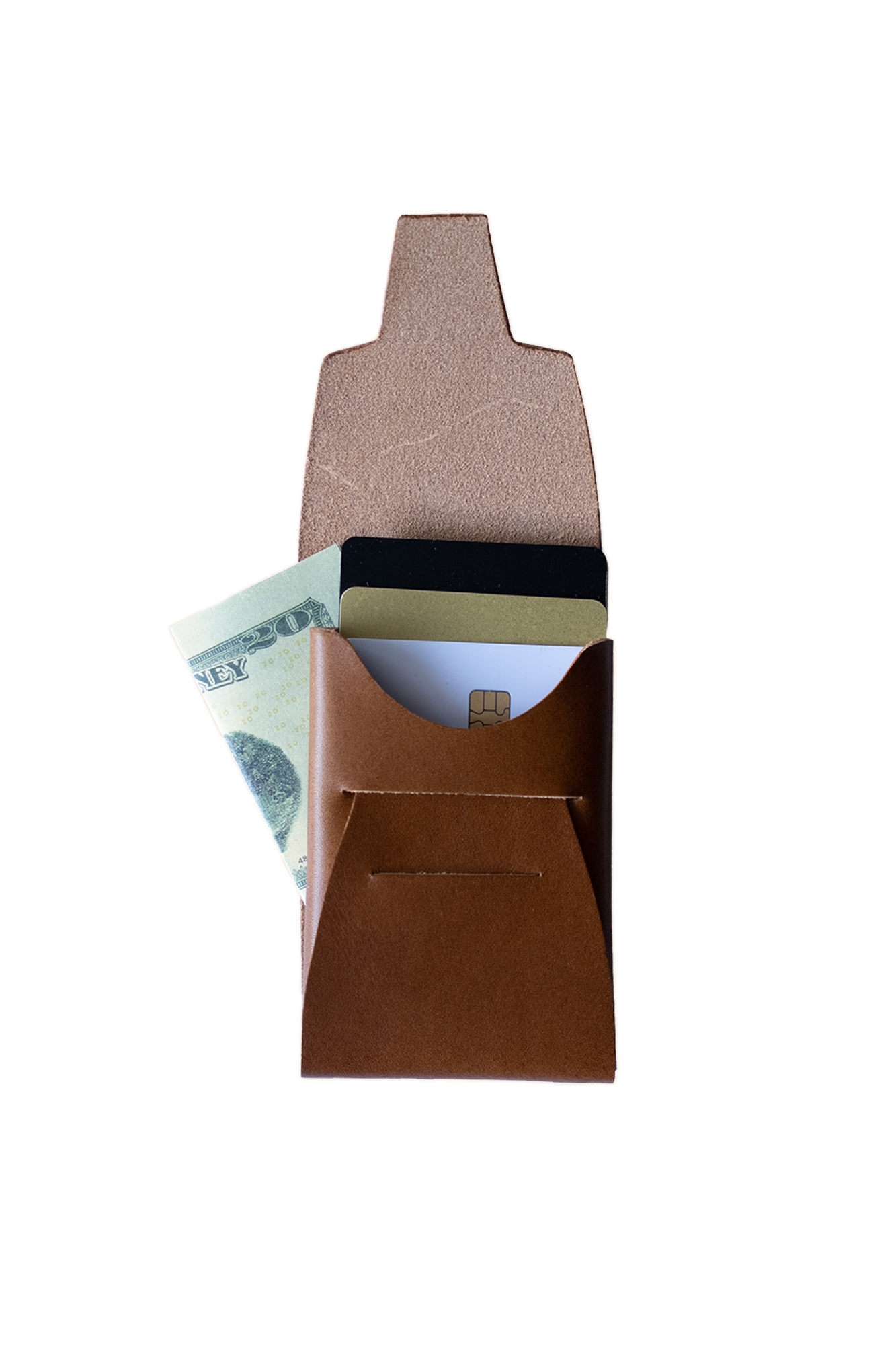 With a pocket for cards (up to 6-8 easily!), and a simple divider for twice-folded cash, receipts, or a quick-draw card pocket, the Johnny Wallet folds into itself, and holds everything you need with no frills.