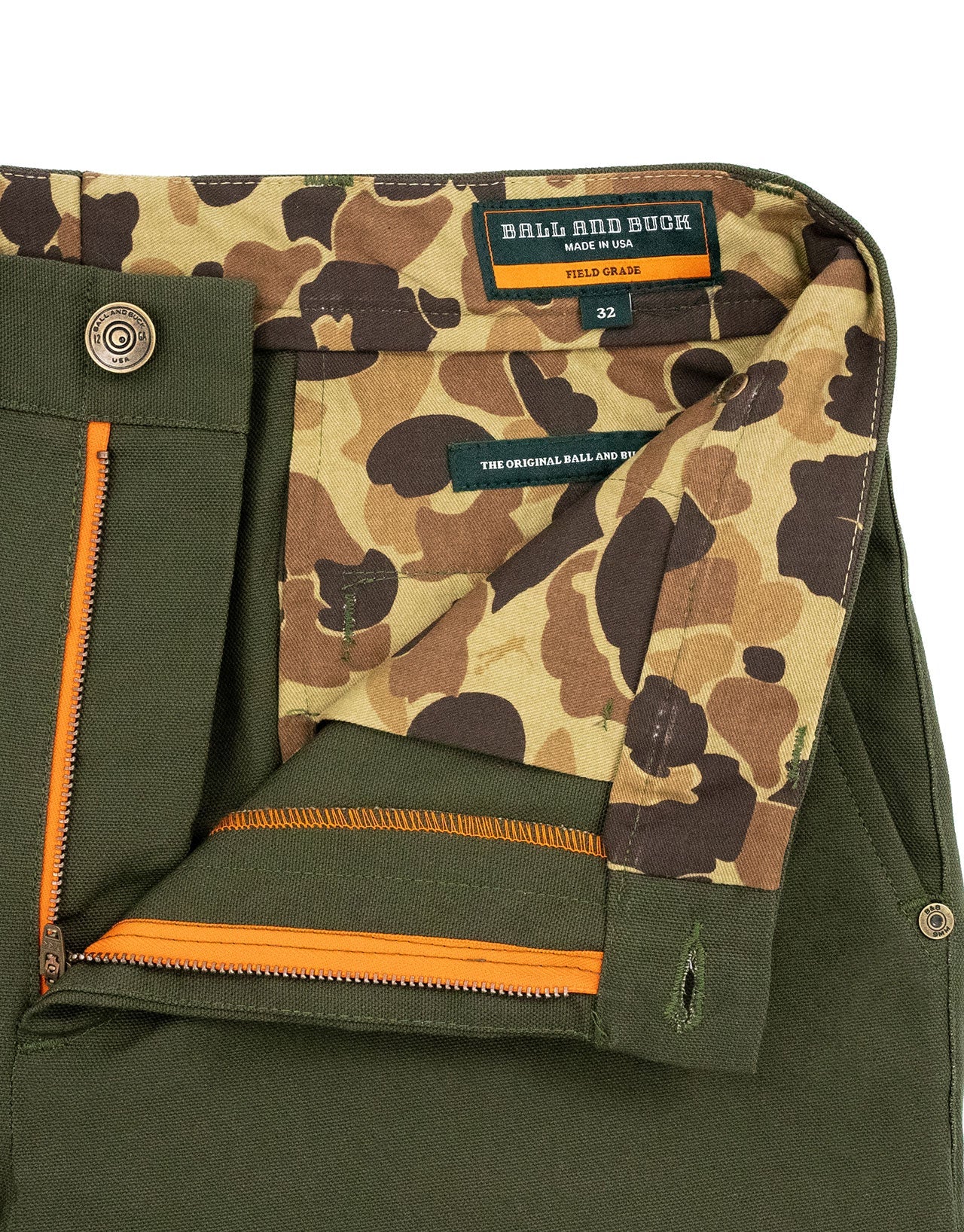 Our classic Field Pant in Pine Duck is a combination of mid-weight 10 oz Duck Cotton and 7 oz TexWax sail cloth waxed cotton legs for full coverage brush protection. Crouch, crawl, hike, and hunt your best in these pants, they'll only get better with age.
