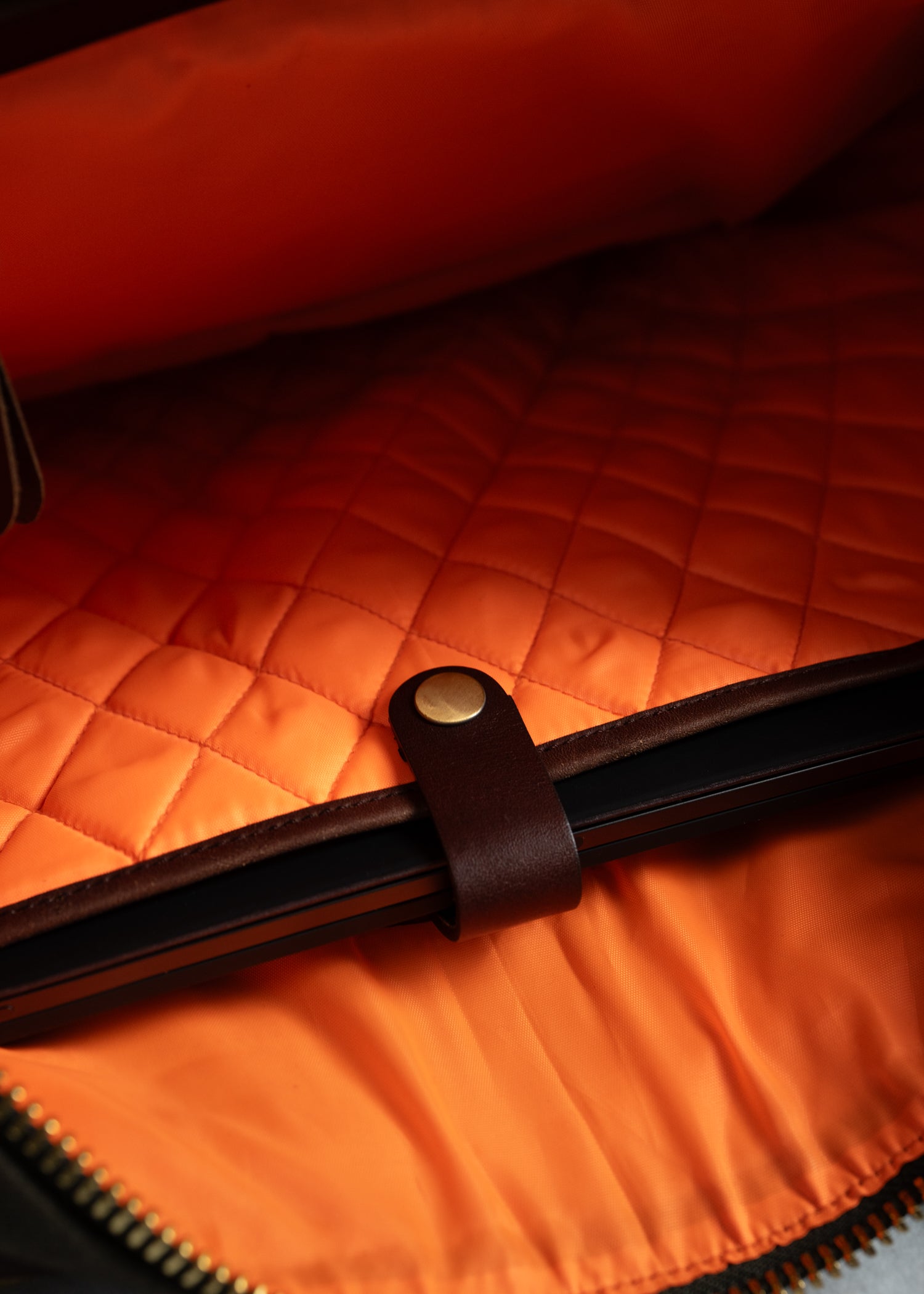 Designed with modern life in mind, the Overland Tote features a padded laptop sleeve with a magnetic closure, securing your devices for commutes or trips. Inside, the iconic orange polyester lining adds visibility, so you can easily find essentials on the go. An interior zip pocket and an exterior leather patch pocket, riveted for durability, provide extra storage and easy access to small items. The Tote Bag is the ultimate everyday carry — rugged, refined, and ready for wherever the day takes you.